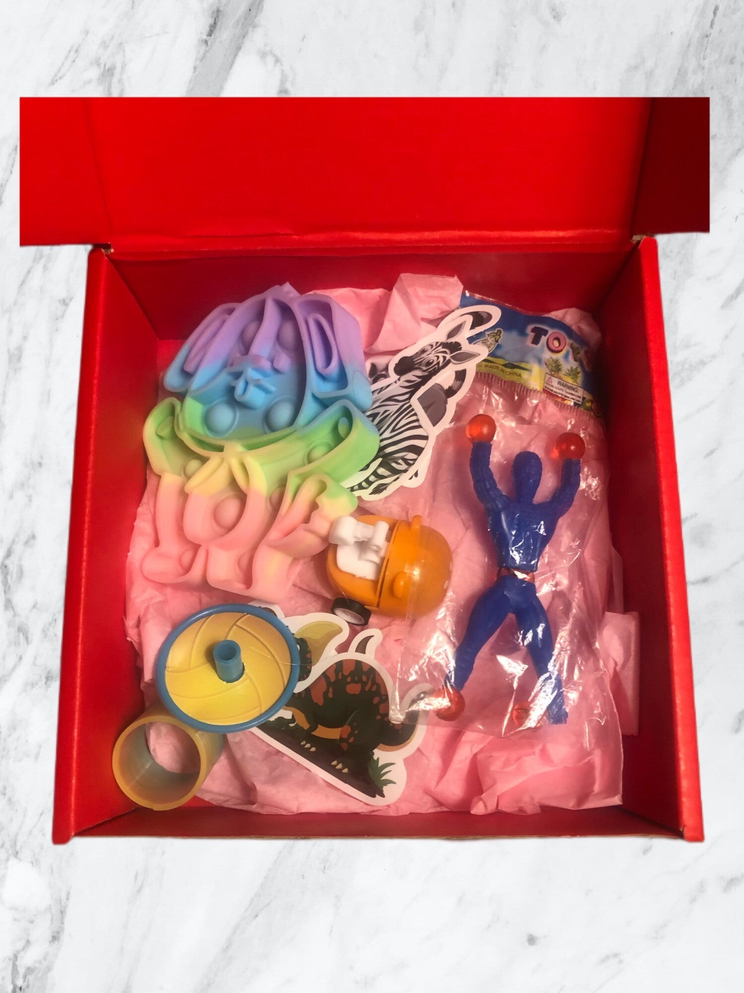 Th si fidget box has all sorts of colors and fidgets like for instance it includes 1 rainbow pop it , 1 blue stretchy man ,1 blue spinner and more .